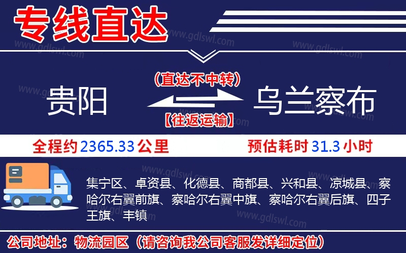 貴陽到烏蘭察布物流專線是一條連接貴陽和烏蘭察布的貨物運輸線路,由陸順物流公司提供直達不中轉(zhuǎn)運輸服務(wù),能為企業(yè)、工廠、貿(mào)易商以及個人提供高效、便捷、可靠的貨運解決方案
